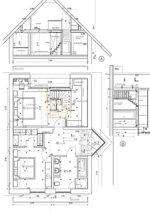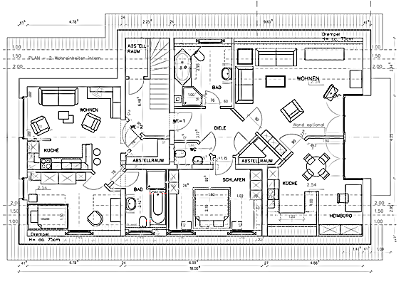 Dachgeschoss- Aufgabenstellung: Planung von zwei Wohnungen mit Möblierungsvorschlag; Maßstab=1:50 |